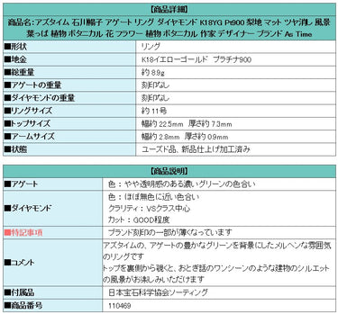 気になることがあったので質問したのですが、すぐ返信があり購入前から安心感がありました。配送も早く、説明通り、鑑定書も付いていて安心しました。今後も入荷をチェックして気にいったものがあれば購入したいと思いました。