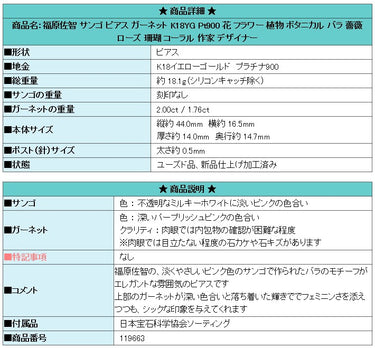 商品名:福原佐智 サンゴ ピアス ガーネット K18YG Pt900 花 フラワー 植物 ボタニカル バラ 薔薇 ローズ 珊瑚 コーラル 作家 デザイナー