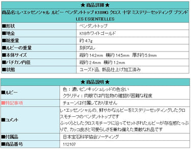 商品名:レ・エッセンシャル ルビー ペンダントトップ K18WG クロス 十字 ミステリーセッティング ブランド LES ESSENTIELLES