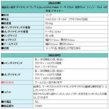 商品名:翁淳 ダイヤモンド リング 0.25ct K18YG Pt900 マーキスカット 変形カット ファンシーカット V字 作家 デザイナー