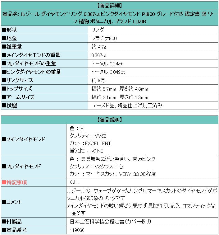 ルジール ダイヤモンド リング 0.367ct ピンクダイヤモンド Pt900 グレード付き 鑑定書 葉 リーフ 植物 ボタニカル ブランド LUZIR | ダイアモンド プラチナ かわいい おしゃれ【中古】【SH119066】