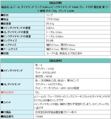 商品名:ルジール ダイヤモンド リング 0.367ct ピンクダイヤモンド Pt900 グレード付き 鑑定書 葉 リーフ 植物 ボタニカル ブランド LUZIR