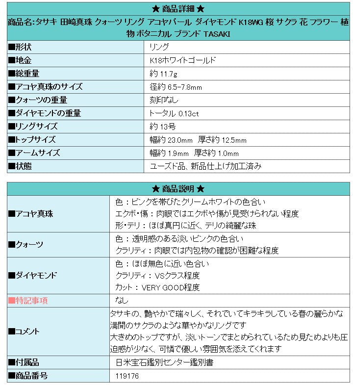 商品名:タサキ 田崎真珠 クォーツ リング アコヤパール ダイヤモンド K18WG 桜 サクラ 花 フラワー 植物 ボタニカル ブランド TASAKI