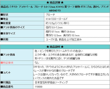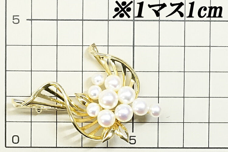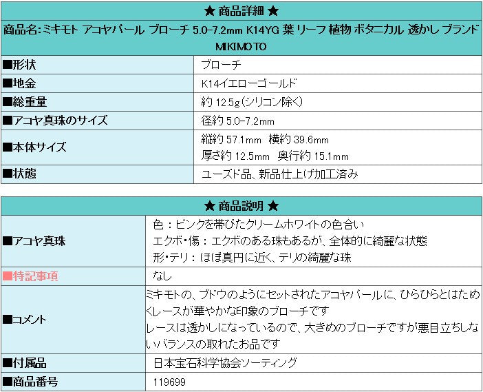 商品名:ミキモト アコヤパール ブローチ 5.0-7.2mm K14YG 葉 リーフ 植物 ボタニカル 透かし ブランド MIKIMOTO