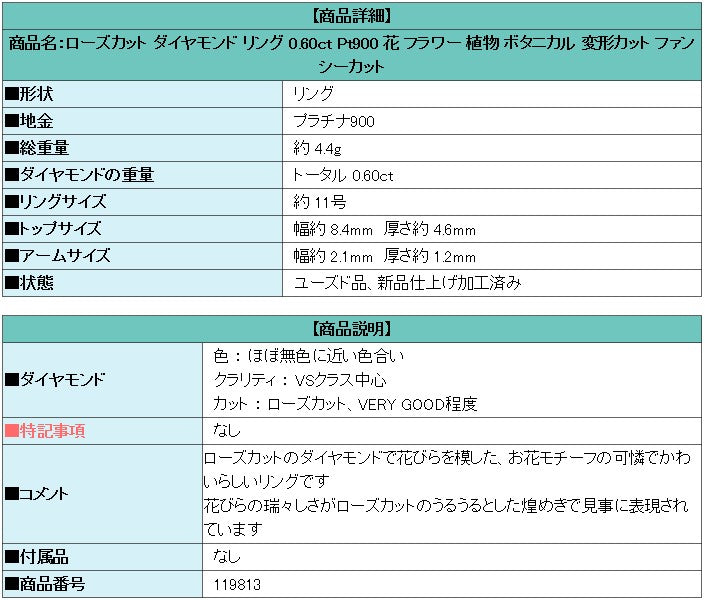商品名:ローズカット ダイヤモンド リング 0.60ct Pt900 花 フラワー 植物 ボタニカル 変形カット ファンシーカット