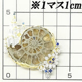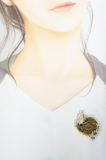 石川暢子の、パイライト化・カルサイト化したアンモナイト化石にサファイアとダイヤモンドをちりばめた、お城とお花のモチーフで装飾した斬新なブローチです