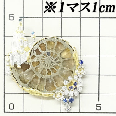 石川暢子 サファイア ブローチ 0.39ct パイライト カルサイト ダイヤモンド K18YG Pt900 アンモナイト フラワー 植物 ボタニカル 城 風景 作家 デザイナー | 18金 サファイヤ ダイアモンド【SH120792】