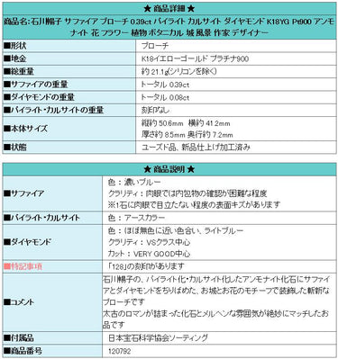 商品名:石川暢子 サファイア ブローチ 0.39ct パイライト カルサイト ダイヤモンド K18YG Pt900 アンモナイト 花 フラワー 植物 ボタニカル 城 風景 作家 デザイナー
