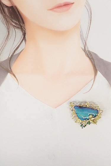 コメント 若林佐代子の、天使が夜空を見上げて思いをはせているようなシーンをボルダーオパールの自然の色合いを用いて見事に表現した、メルヘンな雰囲気のペンダントブローチです。生き生きとした線を描くツルや葉、天使の細やかな彫刻など、細部にまでこだわりを感じるお品です。