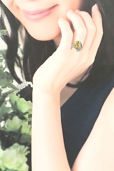 コメント 田村俊一の、イエローゴールドでデザインされた立体的なローズモチーフが際立つ、エレガントなリングです。力強い梨地の風合いやツタをイメージした透かしなど、細かなところにも作者のこだわりを感じるお品です。