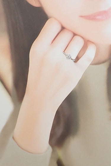 コメント プチレーヴの、お花のように留められたダイヤモンドが眩い輝きを放つ、エレガントなリングです。アームにあるピンクゴールドの小花がワンポイントとして可憐さと遊び心をもたらします。