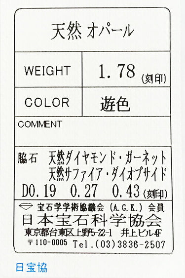 色 :乳白色の地色にオレンジ、グリーン、ブルーの斑のある遊色