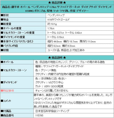 商品名:藤平卓 オパール ペンダントトップ 1.78ct サファイア ガーネット ダイオプサイド ダイヤモンド K18WG ボタニカル 梨地 マット ツヤ消し 作家 デザイナー
