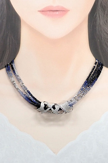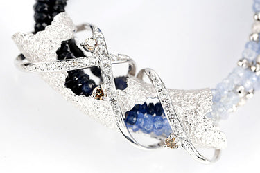 コメント 藤平卓の、グラデーションカラーのサファイアを贅沢に使用した、ボリューミーなチェーンがエレガントな印象のネックレスです。ダイヤモンドの優美なラインに、穴からちらりとのぞくサファイアが、まるで洞窟のジオードのような神秘さを感じさせる、作家こだわりのお品です。