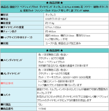 商品名:銀座ミワ ペアシェイプカット ダイヤモンド ネックレス 0.71ct K18WG 花 フラワー 植物 ボタニカル 変形カット ファンシーカット ドロップ 雫 しずく 涙 ブランド MIWA