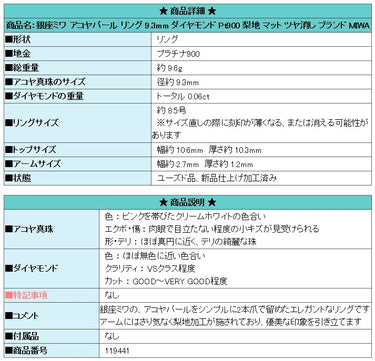 商品名:銀座ミワ アコヤパール リング 9.3mm ダイヤモンド Pt900 梨地 マット ツヤ消し ブランド MIWA