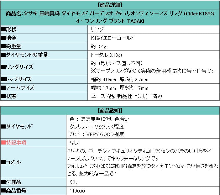 タサキ 田崎真珠 ダイヤモンド ガーデンオブキュリオシティ ソーンズ リング 0.10ct K18YG オープンリング ブランド TASAKI | 18金 ダイアモンド かわいい おしゃれ【中古】【SH119050】