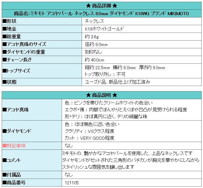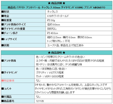 商品名:ミキモト アコヤパール ネックレス 8.0mm ダイヤモンド K18WG ブランド MIKIMOTO