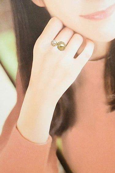 コメント 白蝶パールとアコヤパールをメレダイヤモンドでS字にくるりと囲んだ、ユニークで華奢なリングです。ゴールデンイエローとホワイトのコントラストが高級感を醸し出します。