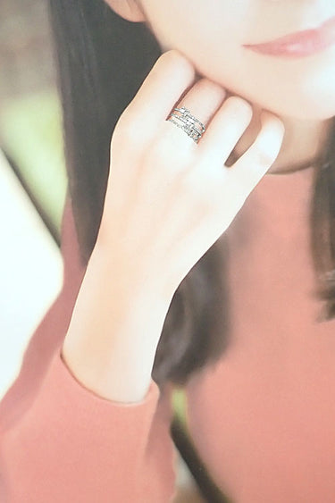 コメント 2種類のカットのダイヤモンドをセットした、華やかな雰囲気のリングです。3本のリングを重ね付けしたようなデザインで、やや幅広ですがカジュアルにお召しいただけます。