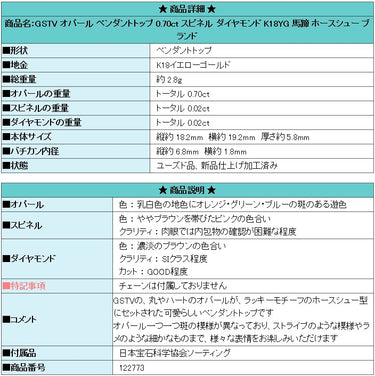 商品名:GSTV オパール ペンダントトップ 0.70ct スピネル ダイヤモンド K18YG 馬蹄 ホースシュー ブランド