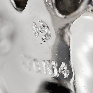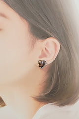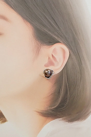 コメント タサキの、大粒の黒蝶パールが大胆にあしらわれた、シックな雰囲気のイヤリングです。フリルのようなラインのフラワーモチーフがアクセントになっています。