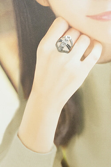 ローリーロドキンの、美しい立体模様から三本のラインがひかれたデザインにダイヤモンドが隙間なくセットされた、ラグジュアリーなリングです