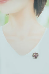 コメント 約1.5ctのテーパーカットダイヤモンドがキラキラと輝く、華やかなフラワーモチーフのピンブローチです。ピンクを基調としたサファイアの色合いがフェミニンな印象を醸し出します。