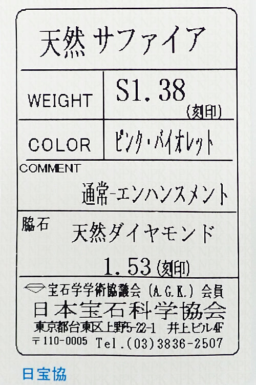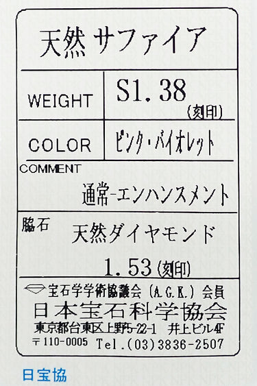 サファイア 色:濃淡のある青みピンク、青みパープル