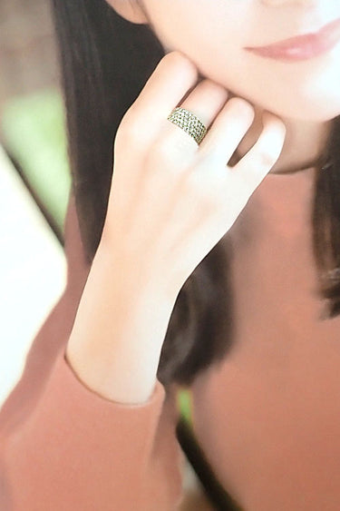 コメント GSTVの、キラキラと輝くダイヤモンドが5列に渡ってセットされた、煌びやかなパヴェリングです。トップ対してアームは細めなので、圧迫感なく快適な着け心地でお召いただけます。