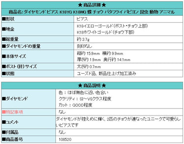 Product name: Diamond earrings K18YG K18WG Butterfly Papillon Insect Animal