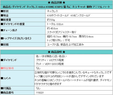 Product name: Diamond necklace 0.02ct K18WG K18PG Cat Animal Heart