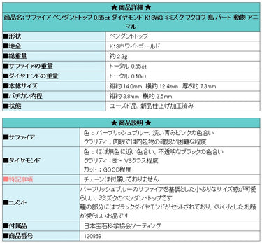 Product name: Sapphire pendant top 0.55ct diamond K18WG owl bird animal