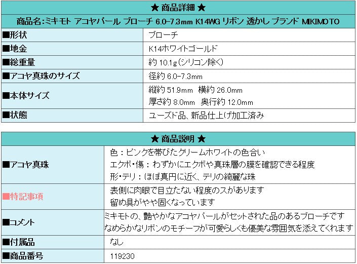 Product name: MIKIMOTO Akoya pearl brooch 6.0-7.3mm K14WG ribbon openwork Brand MIKIMOTO