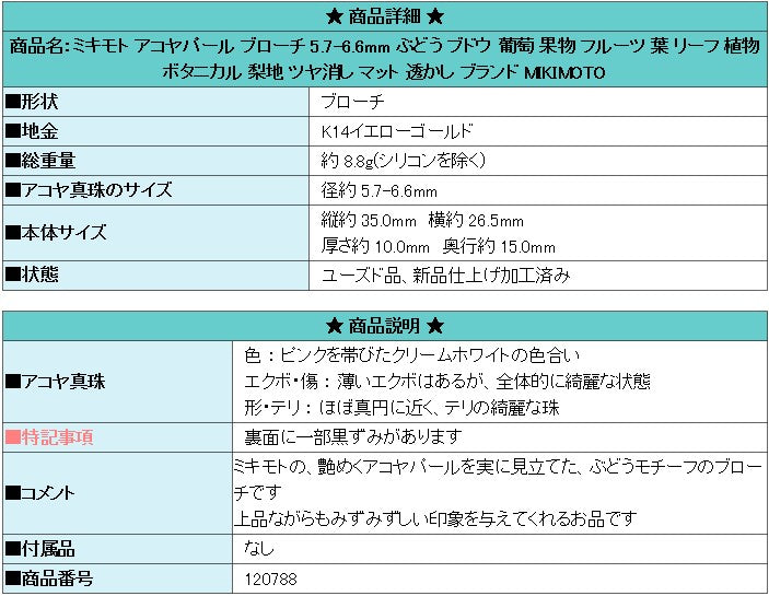Product name: MIKIMOTO Akoya pearl brooch 5.7-6.6mm grapes fruit leaves plants botanical matte finish openwork brand MIKIMOTO