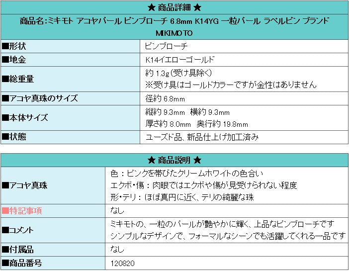 Product name: MIKIMOTO Akoya pearl pin brooch 6.8mm K14YG single pearl lapel pin Brand MIKIMOTO