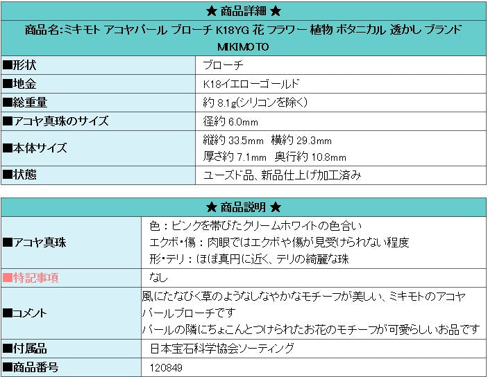 Product name: MIKIMOTO Akoya pearl brooch K18YG flower plant botanical openwork brand MIKIMOTO