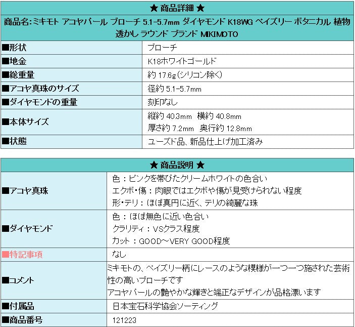 Product name: MIKIMOTO Akoya pearl brooch 5.1-5.7mm diamond K18WG Paisley botanical plant openwork round brand MIKIMOTO