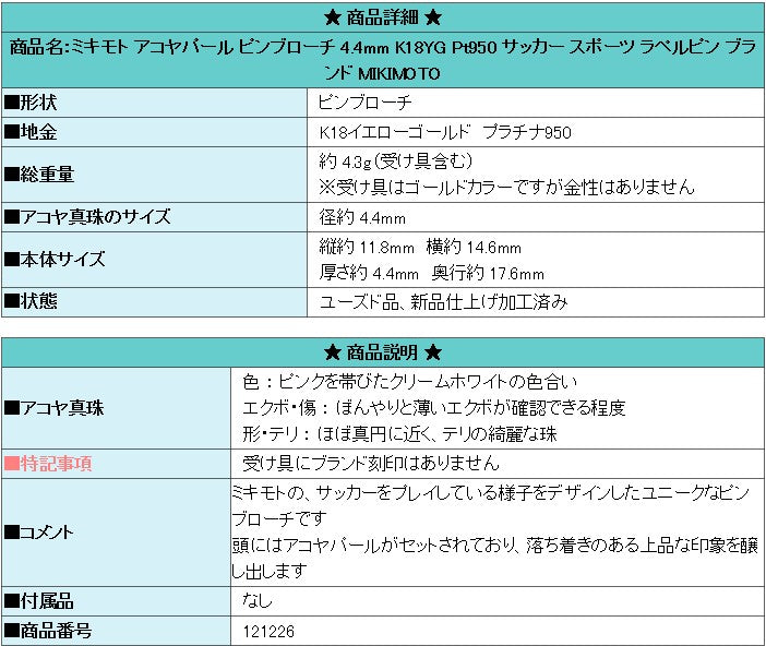 Product name: MIKIMOTO Akoya pearl pin brooch 4.4mm K18YG Pt950 soccer sports lapel pin brand MIKIMOTO