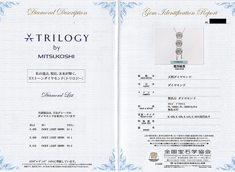 商品名 三越 トリロジー ブラウンダイヤモンド ネックレス ダイヤモンド Pt900 Pt850 MITSUKOSHI ループタイ スライド