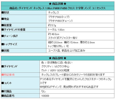 Product name: Diamond necklace 1.00ct Pt900 Pt850 Cross Men's Unisex