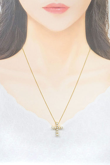 This necklace by Mikimoto features a cross motif and Akoya pearls, giving it an elegant yet sharp look.