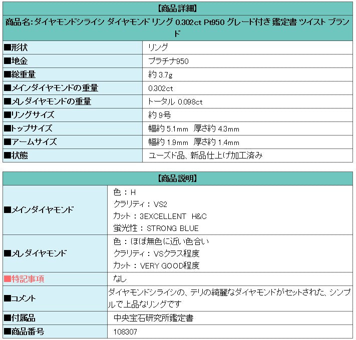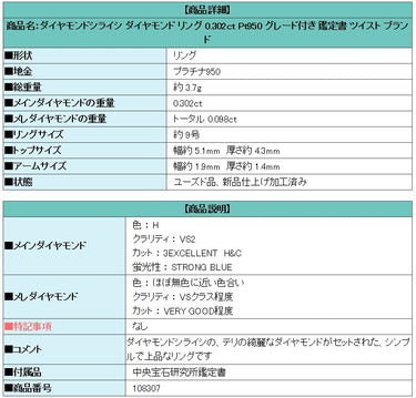 Product name: Diamond Shiraishi Diamond Ring 0.302ct Pt950 Graded Certificate Twist Brand