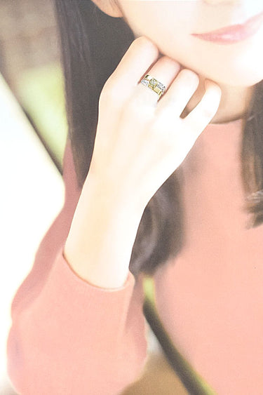 This is a cool square-shaped ring with a refreshing greenish yellow diamond set as the main piece by Tasaki.