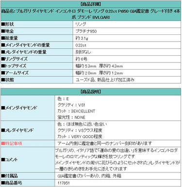 Product name: Bvlgari Diamond Incontro D'Amore Ring 0.22ct Pt950 GIA Certified Graded 4-prong Brand BVLGARI