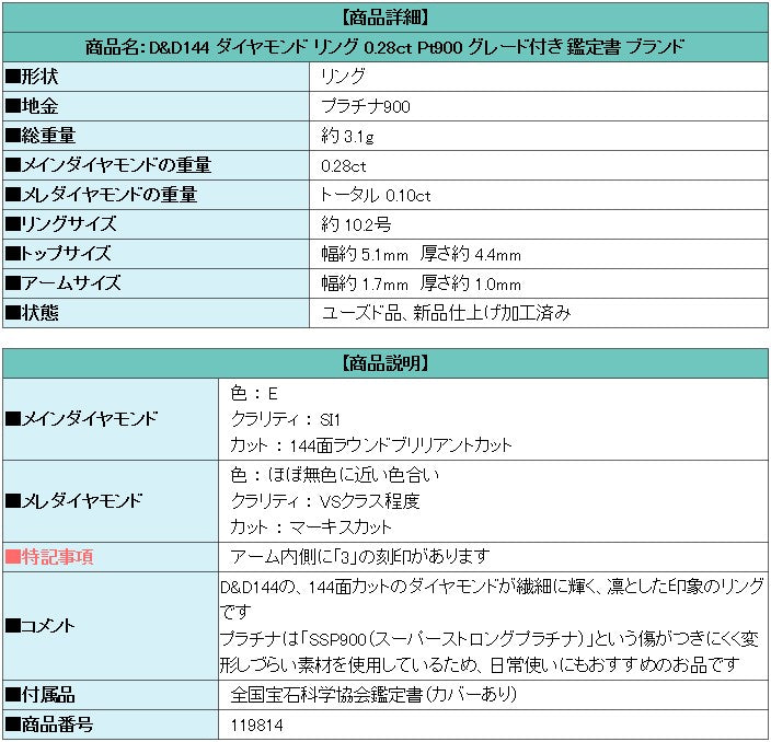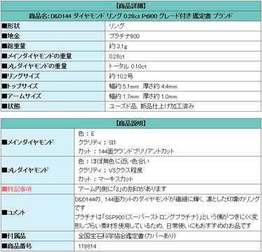 Product name: D&D144 Diamond Ring 0.28ct Pt900 Graded Certificate Brand