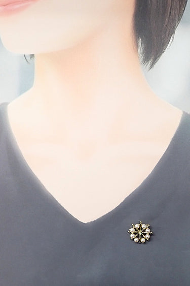 コメント ミキモトの、放射線状に広がるイエローゴールドのラインの間に、艶やかなアコヤパールがやさしく輝く、上品なブローチです。チェーンの通し穴があるためペンダントトップとしてもご使用いただけます。