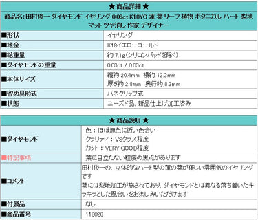 Product name: Shunichi Tamura Diamond Earrings 0.06ct K18YG Lotus Leaf Plant Botanical Heart Pear-textured Matte Finish Artist Designer