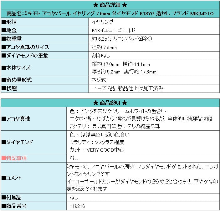 Product name: MIKIMOTO Akoya pearl earrings 7.6mm diamond K18YG openwork Brand MIKIMOTO