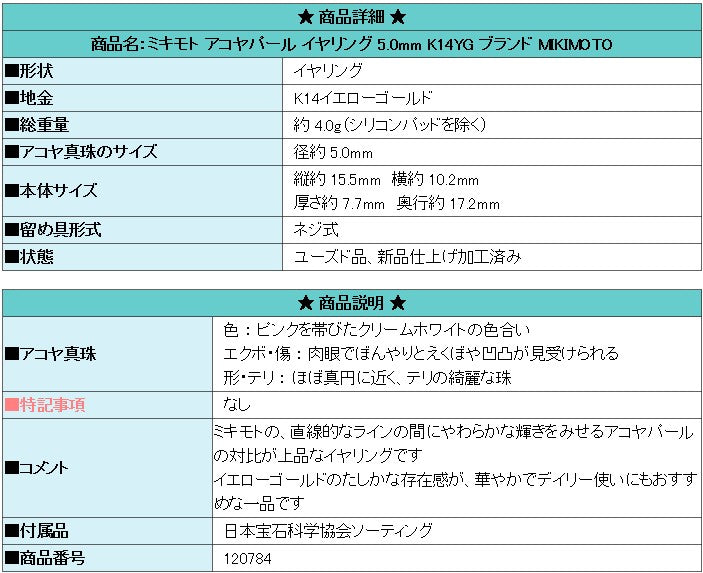 Product name: MIKIMOTO Akoya pearl earrings 5.0mm K14YG Brand MIKIMOTO